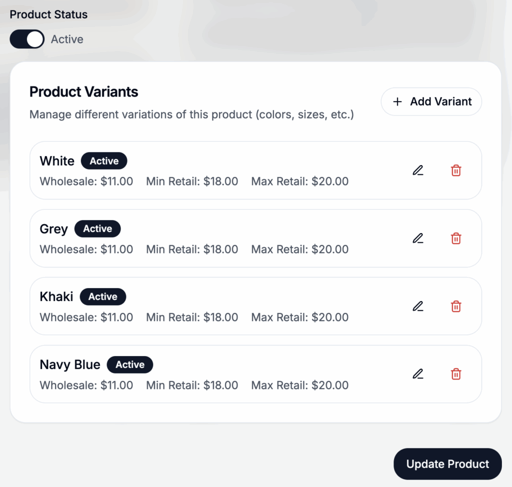 Pricing is very important. You must add your wholesale cost. It is best to that this price reflects shipping. Our platform allow for organizations to adjust the retail price of your products as long as you set a range. If you range doesn’t make sense, add the same retail price in all the fields. By default, all pricing for an organization will be set to the suggested retail price.