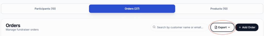 The most common option will be to export the “Entire Fundraiser”. This is pdf overview. The other is the “Participant CSV” export. This shows you the individual sales and profits of anyone who tracked on order.