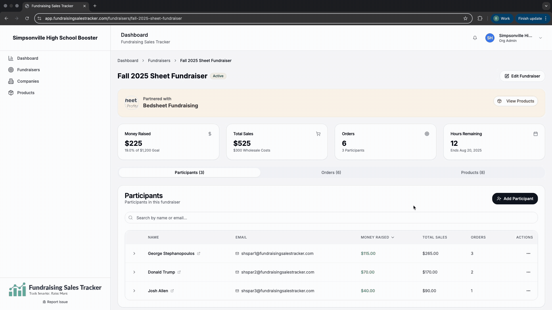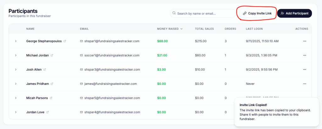 After you have created a fundraising campaign and set your parameters, you need to invite everyone who will be participating in selling. Only participants can record or create orders. Look for “Add Participant” button located under the main dashboard or a specific fundraiser under the participants tab.